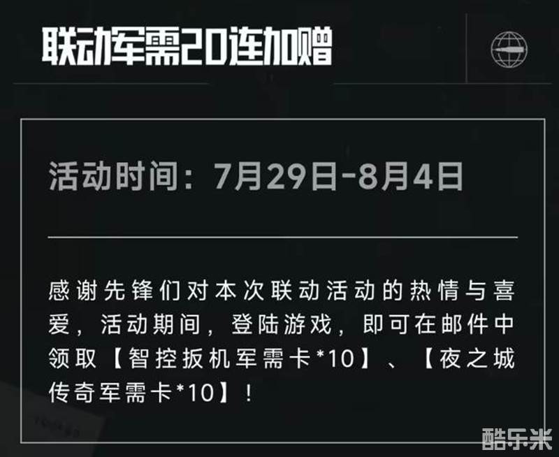 感谢先锋们对本次联动活动的热情与喜爱,活动期间,登陆游戏,即可在邮件中领取【智控扳机军需卡10】、【夜之城传奇军需卡10】!