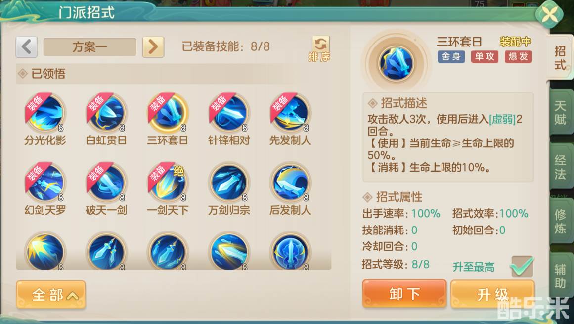 任剑逍遥:辅助型攻击招式,使用后获得“逍遥游”状态,该状态下速度提高,可以确保自身有出手的机会,若搭配天赋,则可进一步降低使用三环套日的限制。