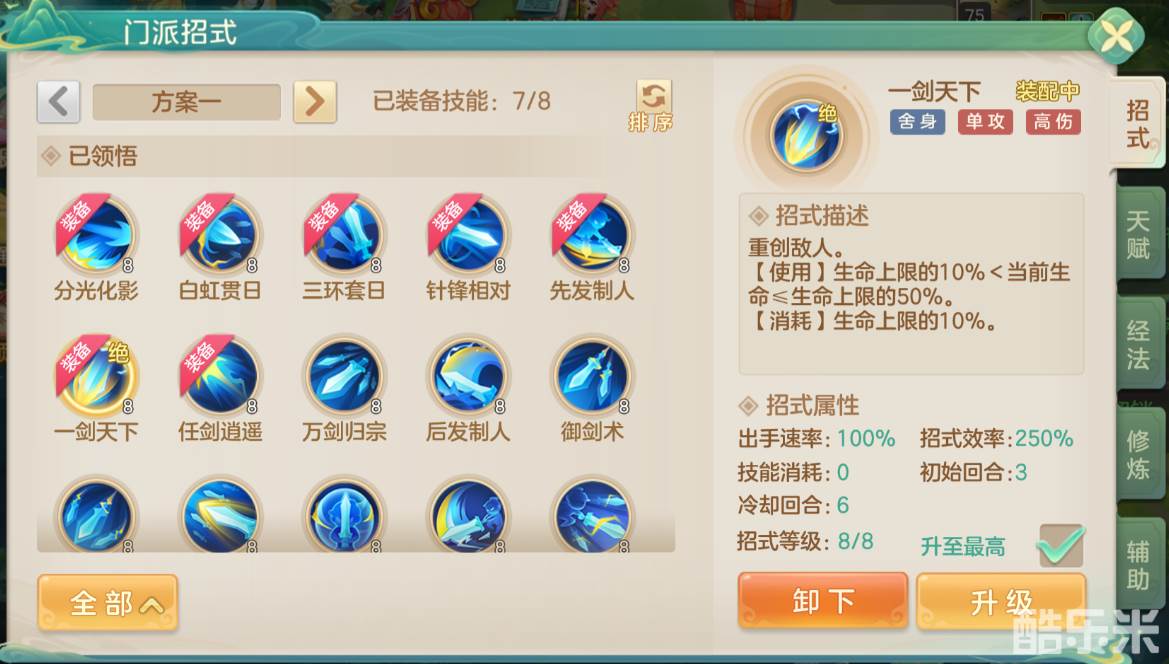 一剑天下:爆发仅次于三环套日的招式,也会对敌方目标造成大量的伤害。但释放条件有一定生命限制,需把握好出手实机。