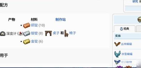 深度计的具体获取方式分为两种途径。第一种是通过合成制作,需要准备10个铜锭、8个银锭和6个金锭,在工作台和椅子旁进行合成。这种方法在部分旧版本中可用,但当前主流获取方式仍是击败怪物掉落。第二种途径是击败洞穴层出现的蝙蝠类敌人,包括普通洞穴蝙蝠、冰雪蝙蝠和孢子蝙蝠等变种,这些敌人都可能掉落深度计。