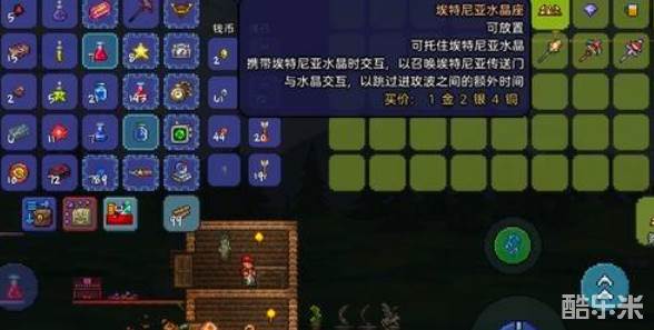 该NPC仅在击败世界吞噬怪或克苏鲁之脑后才会出现,通常以昏迷男子的形态随机生成在世界任何地层。与酒馆老板对话后,可以购买关键道具埃特尼亚水晶台和埃特尼亚水晶,这两件物品是启动事件的必备材料。建议在购买前确保背包有足够空间,并准备好足够的金币。