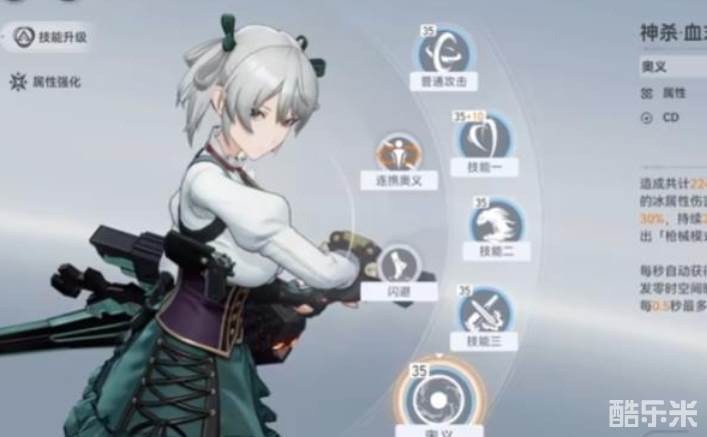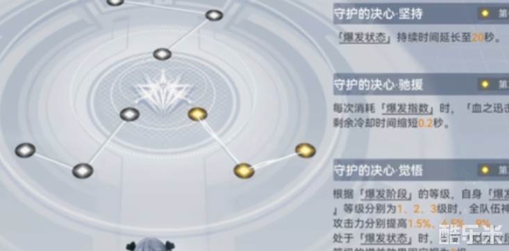 三技能在地面主要用来切换枪械和神机形态,空中使用时能造成占比最高的伤害,同时刷新一技能升天的CD,爆发阶段可以优先使用该技能。玩输出血弹雪儿主打中线神格,可以在爆发状态快速获得血点,每次消耗血点都能获得大量buff, 中三神格还提供了每一轮循环接近百分之四千倍率的技能伤害。血弹雪儿当连携辅助亚莉莎时就使用右线神格,伤害虽然没有中线高,但有一个额外攻击力提升效果,适合亚莉莎和血弹雪儿练度相同或者亚莉莎超过雪儿练度时使用,如果打纯火区迭代就直接当辅助工具人就行了。