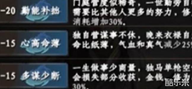 力敌万夫天赋适合喜欢战斗的玩家,可以提升15%的伤害输出。修身齐家天赋则适合偏好生活玩法的玩家,能增加5点生活技能属性值并使效果翻倍。提升福气和容貌的天赋也有助于触发隐藏剧情和结交特殊NPC。其他天赋如增强悟性、磨砺精神等都可以根据个人喜好自由搭配。