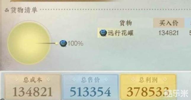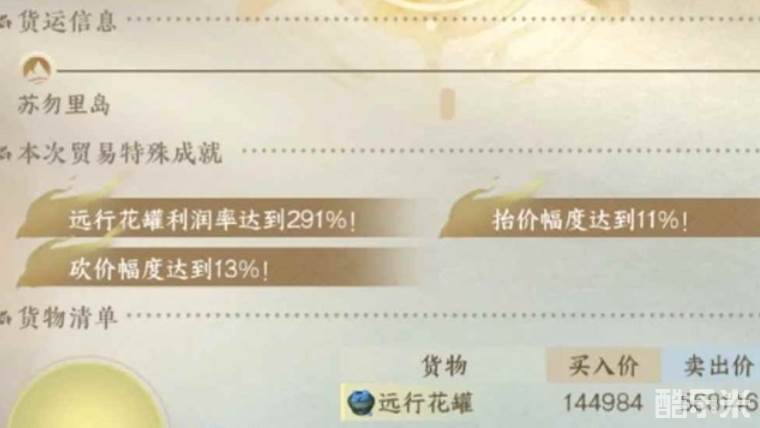 苏勿里买远行花罐卖到刺桐港/无更市,利润42w+(我这边第二趟刺桐港贸易战税率55%所以可以对比一下这两个哪个利润高就卖哪个)