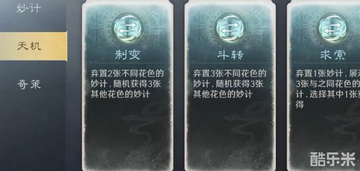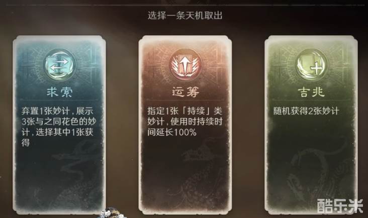 吉兆会随机获得两种不同的妙计,发育期也就是前三天,高概率获得林和山,发育期过后会比较随机。观星这张牌有几率拿到一张或者三张牌,只有在展示的三张妙计中,有两张一样的牌才会只获得一张牌。观星这张牌在前三天只有林和山时,一般情况下只能获得一张牌。交战期如果获得风、火、山、林四种花色中的单一花色各一张,或者同时获得三张风则会直接获得三张牌,同时我们还会获得一个星罗棋布的谋策称号。预知这张牌类似谋杀甄姬的洛神技能,但要注意的是,展示牌不会展示重复牌,所以运气最好的话也就是同花色最多三张牌。如果火的话,最多四张牌。卜应制定并随机获得一种花色的妙计,这张一般不需要选择。