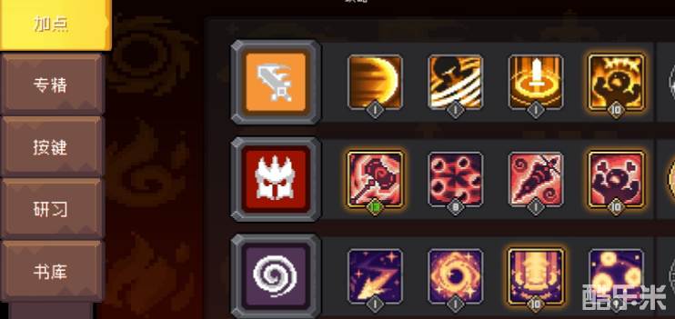 狂热怒吼提供战意和狂怒,战意增加全体伤害狂怒增加攻击速度和全体伤害,战意可以给浴血战意提供额外黑暗伤害,蓄势提供蓄力速度和战意,黑暗漩涡为主要攻击方式,并且也是专精技能,凝血怒吼也是专精技能,但只是专精载体,只需要点8点够装专精就行,黑暗代偿可以提供攻击范围和攻击力,遁入虚空点一点用来保命。