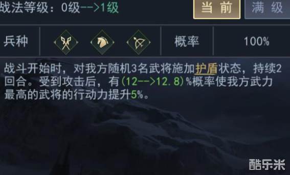 前军上阵武将刘备。刘备可以为全体武将提供伤害减免,恢复兵力,施加护盾,施加“抵御”状态,是最合适该阵容的辅助武将,117的初始防御,2.35的防御成长值让刘备站在前军可以有效的抗住地方的伤害。战法方面,给刘备佩戴辅助战法“以战养战”“铜墙铁壁”,或者治疗战法“固本培元”“驱疾疗伤”都是可以的,刘备主要依靠的就是自带的主战法,其余战法都是起到锦上添花的效果。