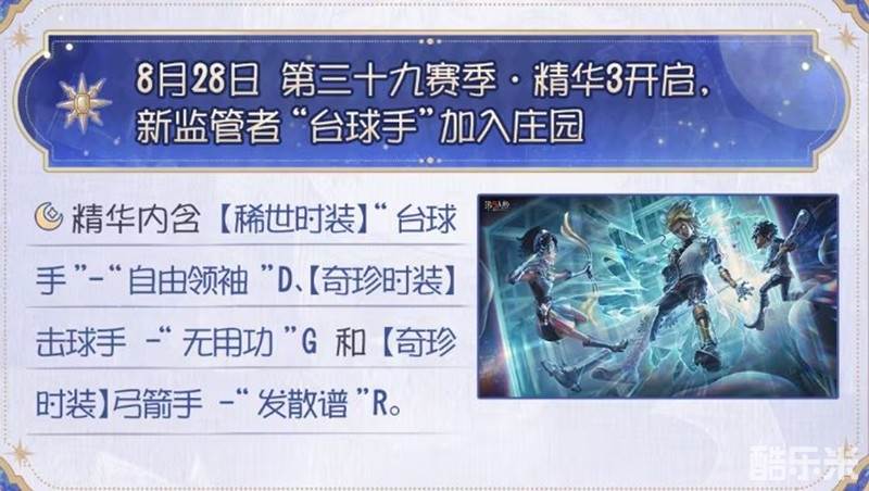 第三十九赛季精华3的上线时间为8月28日,维护后玩家即可体验。这一赛季的精华3中包含了多款全新的时装,包括稀世时装“台球手”-“自由领袖”D、奇珍时装击球手-“无用功”G和奇珍时装弓箭手-“发散谱”R。