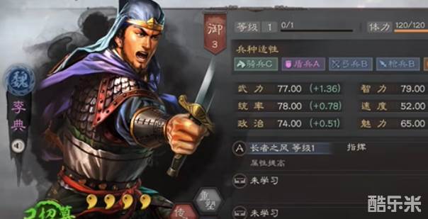 李典定位为辅助型武将,其核心价值在于自带指挥战法长者之风,能够提升我军全体武力与智力属性。该战法在前期尤为关键,因武将基础属性较低时,百分比加成能显著提升队伍输出与生存能力。李典的兵种适性以盾兵为最优(S级),弓兵次之(A级),推荐优先选择盾兵阵容以发挥其防御特长。属性成长方面,武力与智力均衡但不出众,需通过战法和装备弥补短板。