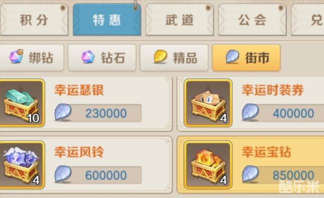 特惠的街市有个幸运宝钻,银币购买,能开几个全看脸,刷新一定要全部买光,没有银币就拿金币顶不用纠结,买完建议存仓库,存多一些等到用的时候再一次性开,开到高数量的几率高一些。