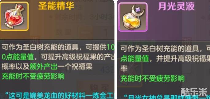 除开特惠以外,我们日常一条和藏宝图挖宝过程中有概率获取圣能精华,月光灵液和冰晶露,这三个材料充能是不受充能衰减影响的,我称之为正牌充能资源,在日常活动中获取到这三种材料后个人建议别在前三次充能中使用,留着或者存着充第四次后的衰减充能。
