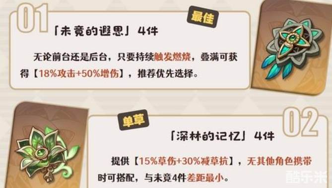 在原神中艾梅莉埃最适配的圣遗物是未竟的遐思四件套,单草队伍可以选择深林的记忆四件套,散搭推荐使用攻击\草套\剧团组合,而剧团四件套整体表现一般,不建议刻意凑齐四件套。下面和酷乐米小编一起来看看吧