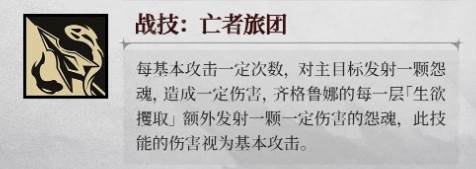 齐格鲁娜的亡者旅团战技则是她的另一大亮点。通过一定次数的基本攻击,齐格鲁娜会向敌方发射怨魂,造成额外伤害。而每层“生欲搜取”都会进一步增加怨魂的发射次数,意味着她可以在短时间内对敌人造成更大压力。这使得齐格鲁娜不仅是一个单体输出者,还是一个能够在群体战斗中发挥巨大作用的角色。