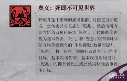 奥义——死即不可见世界,更是她最具压制力的技能之一。齐格鲁娜释放的怨灵集群会对指定目标造成伤害,并施加“死兆”效果,这让敌人不得不在短时间内面对极大的生死威胁。同时,齐格鲁娜还会为所有友方影猎者施加“怒意”增益效果,大幅提升其输出能力。敌人在“死兆”效果下的弱点暴露无遗,而“怒意”则使得齐格鲁娜和她的队友能够迅速消灭目标。