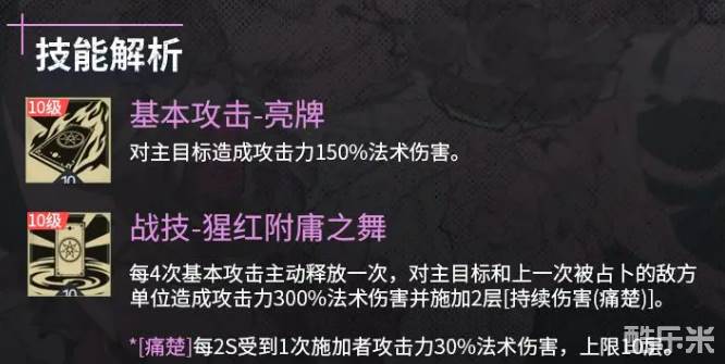 他的技能机制来看。普通攻击“亮牌”虽为单体输出,但伤害倍率尚可,在战斗初期提供稳定的法术伤害输出。核心战技“猩红附庸之舞”则极具实战意义,它在每完成四次普攻后自动触发,对两名敌人造成高额伤害并施加两层“痛楚”,这个持续伤害效果可以叠加至十层,构成了持续输出的重要手段,对敌方后排和高护甲单位都能起到消耗作用。