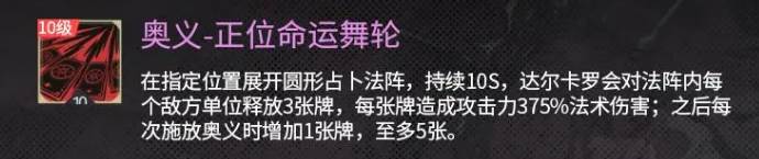 达尔卡罗真正的战略价值体现在其奥义“正位命运舞轮”上。每次释放奥义,都会在指定区域展开一个持续10秒的大型法阵。在法阵范围内,敌人将受到多张牌的攻击,初始为3张,每次施放后叠加一张,最多可至5张。当奥义叠至顶层,对单体敌人可造成极高的爆发伤害,覆盖敌方全体时也能构成极强的群体压制。