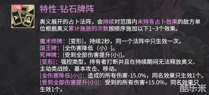 达尔卡罗的特性“钻石牌阵”为奥义增添了极具战术意义的占卜效果。首次施放奥义时,会使敌方陷入“变形”状态,造成强控制。第二次在控制基础上附加全伤害降低。第三次后叠加受到伤害提升,三种减益将持续应用于新进入法阵的敌人,配合其奥义与战技,可以有效限制敌方节奏,构建稳定的输出环境。