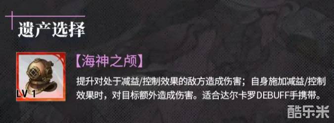 遗产方面,【海神之颅】极为适配达尔卡罗的技能特性。它在敌方处于减益或控制状态时提升输出,而达尔卡罗本身技能即频繁施加控制与减益,能够充分发挥遗产加成。