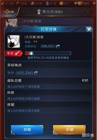 进入军情详情以后,列表显示当前正在向你行军的部队信息,对于向你发起进攻的对象,点击查看详情,可以选择忽略或求援。忽略,则不再闪红光提醒并无法点击求援按钮;求援,则向联盟发送求援信息。
