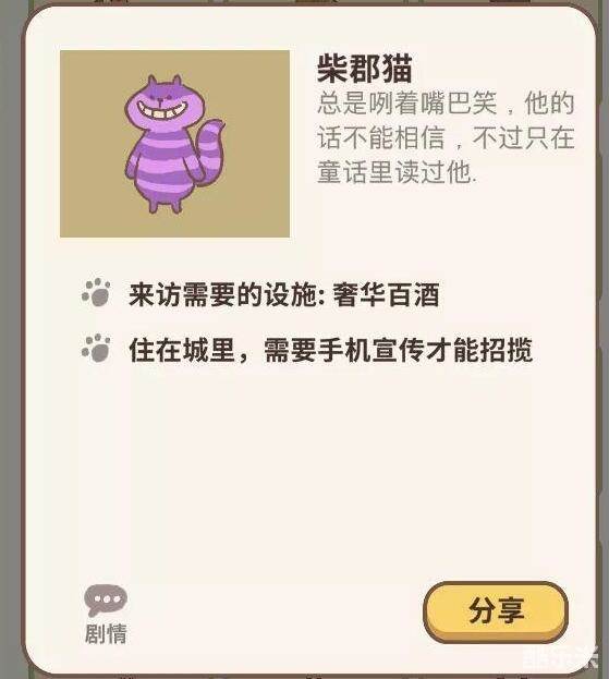 1、柴郡猫顾客的开启方法还是很容易的,在游戏前期只要升级到最高宣传模式,可以轻轻松松就招揽到柴郡猫来餐厅吃饭。柴郡猫的剧情点开,会说这样两段话: