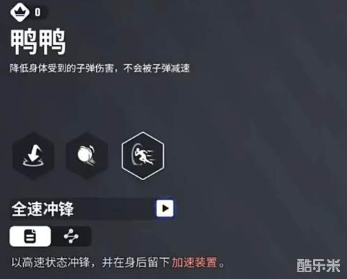 鸭鸭是进攻,他的“翻滚”会让自己变身成圆球形,并在地面快速滚动,在滚动过程中能将碰触到的敌人给击飞并附带伤害,自身在这个期间能获得减伤,伤害累积到一定会强制退出,他的“超鸭风盾”会召唤出一个不会阻碍移动的风盾,来帮助阻挡子弹以及投掷物,他的必杀会向着前方跳起,用自己身躯砸击敌人,猛烈的冲击波能对范围内敌人造成直接伤害,让距离较近的敌人被击飞,较远的被减速。