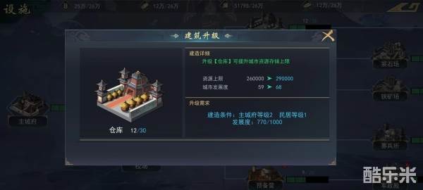 在资源型建筑中玩家应最先升级仓库,仓库能提高资源存储数量的上限,保证资源不会溢出。在游戏中资源积累和储备最为重要,想要提高发展度,也得有足够多的资源储备去升级建筑,所以,仓库的升级是首选。