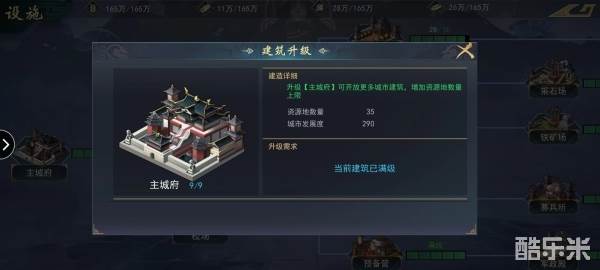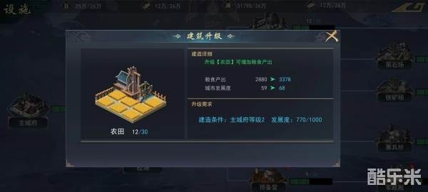 玩家想要快速提高发展度,只能依靠建筑的升级。在游戏中除了主城府外总共有两类建筑:一类是资源建筑,另一类是军事建筑,军事类建筑又分属性设施,城防设施,兵力设施及天策府与锱重营两个独立建筑。