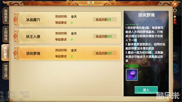 再次强调进入副本后要注意看副本提示,可以大大降低通关难度,想强化装备的小伙伴可不能忘了打须臾梦境哦,一天有两次挑战机会