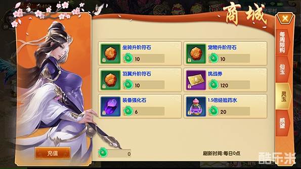 可花费灵玉购买丰富道具,包括进阶符石、挑战券、强化石、经验药水;