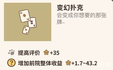 变换扑克有两个作用,一是提高评价35星星,还有就是增加前院整体收益1.7~43.2星星,还有就是装饰前院墙壁的作用了。