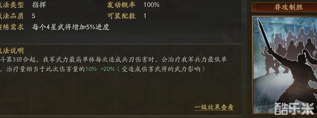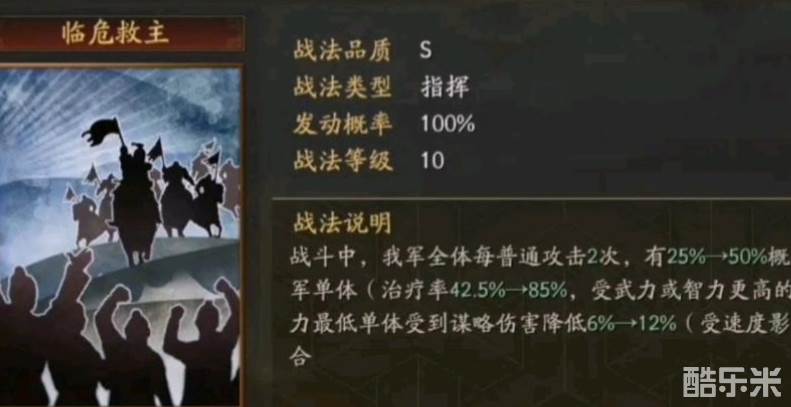 最近推出的几个战法和武将,其实体现了策划的明确态度,别说武将了,连战法都给你规划好,一个队伍最多有一两个战法可以微调,大部分情况只能照着推荐来。临危救主和非攻致胜从设计出来的时候,就是一个给sp马超、一个给sp关羽的t0队伍拖回合准备的。两个技能的回血上限差距也不大,上限五六千居多。如果满红大佬需要连穿的话,需要搭配其它的一两个奶技能。下面和酷乐米小编一起来看看吧