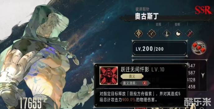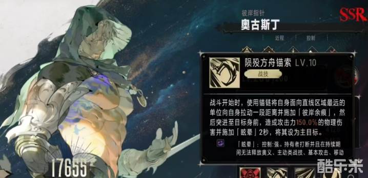 战技叫做陨殁方舟锚锁,这个技能在战斗一开始,角色会向战场直线最远单位释放幽冥锚链,将目标强制拖拽至身前并附加两层彼岸残痕,随后以鬼魅般的身法突进造成150%物理伤害,配合2秒强控眩晕,这套连招不仅具备优秀的先手控制能力,更能通过印记叠加为后续输出铺路,在基础属性层面,作为SSR品阶的角色,奥古斯丁的成长曲线呈现后发优势。