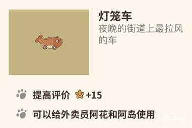灯笼车是动物餐厅的纪念物,同时也是外卖员阿花和阿岛的外卖车,可以给两位外卖员装配。