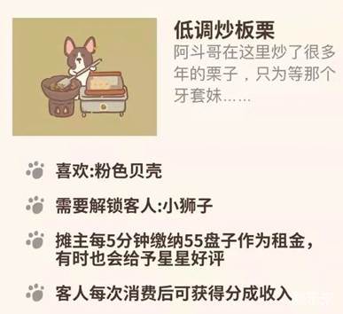 在动物餐厅游戏当中,低调炒板栗是鱼塘摊主之一。相信很多玩家还不清楚,摊主低调炒板栗怎么解锁。下面和酷乐米小编一起来看看吧