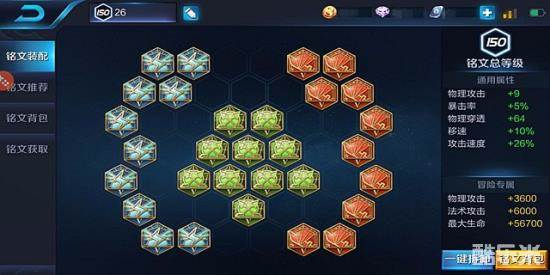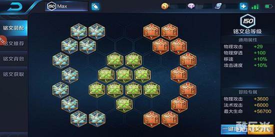 第一套方案小编推荐的铭文是蓝色狩猎X10+绿色鹰眼X10+红色异变X10,也就是所谓的移速攻速百穿,这套铭文在前期提供了100的护甲穿透,可以在前期特别是四级的时候一套打出非常高的伤害。