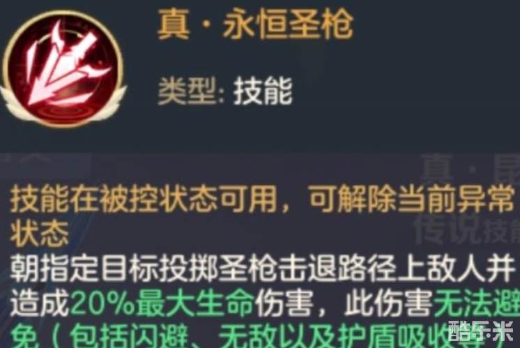 战甲技能永恒圣枪,技能被控状态可用,并且使用立刻接触当前异常状态,技能附带击退效果并直接造成20%最大生命的伤害,伤害无视无敌,护盾吸收,无法闪避(必中),且触发必中要害效果。