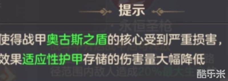 必中要害效果是针对上一代战甲奥古斯之盾的伤害存储量被大幅降低削弱,除此以外,奥古斯之盾的沉默控制也是被克制针对无效,整体而言,奥古斯之盾在1v1模式中已经被昆古尼尔圣枪完全压制了,前提是奥古斯不沉默你,你就别开圣枪。