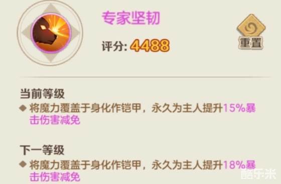四天赋拉满以后接着就是来看第二天赋,第二天赋是除特定玩法以外所有职业统一选择爆伤减免天赋,可以适当提升等级,一般来讲暂时大概点到15%左右就可以停了,但二天赋只适合输出职业作为第二个天赋技能升级,对于防御职业来讲,二天赋优先级不如第三天赋。