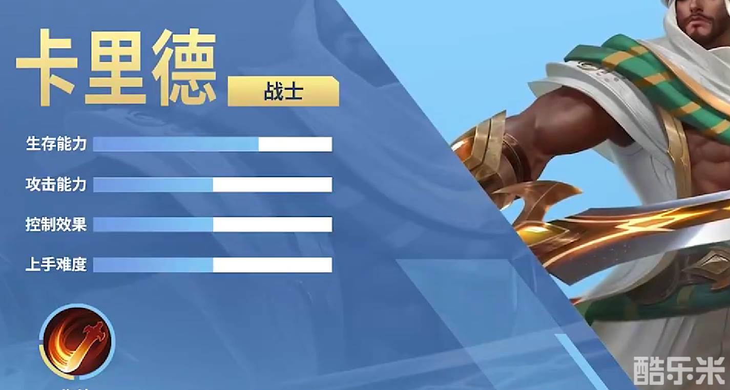 卡里德在游戏内定位是战士,作为狂沙勇士,他有极强的战斗攻击性,并且还具备有一定的防御能力。