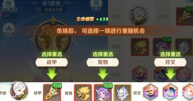 在决斗天梯每次负场以后,可以拥有一次重新选择的机会,可以任意选择战甲,传说符文和宠物