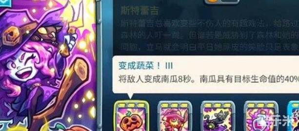 变成蔬菜是斯特蕾吉的核心技能之一。使用后能将敌人变成南瓜,被变身的敌人会立即损失60%最大生命值。这个技能在对付高血量敌人时效果尤为显著,可以快速削减敌方战斗力。需要注意的是变身效果对boss级敌人持续时间较短。
