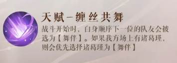 天赋“缠丝共舞”诸葛诞会根据场上的队友顺序,选择一位作为舞伴。而有意思的是,如果场上有诸葛瑾,他将优先选择自己哥哥作为舞伴。这一设计,也给诸葛兄弟的组合提供了更多的战术选择,能够迅速提升整体作战效率。