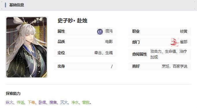 战斗开始时,【巫傀形】主导身体。一回合中,我方每有一个不同属性每有一个不同职业的密探使用普攻技能后,史子吵赴烛会获得4层【牵念】(可叠加100层)。我方密探行动开始至结束前,若史子眇赴烛有至少100层【牵念】,则可以通过点击<牵念标记>,消耗100层【牵念】,将自身短暂转换为【道者形】,为我方全体恢复生命,恢复量相当于自身100%的攻击力,并为我方全体附加【残梦归】(4回合)和护盾(2回合)护盾量相当于自身150%的攻击力,随后变回【巫愧形】。【残梦归】:我方行动结束时,恢复自身15%的最大生命
