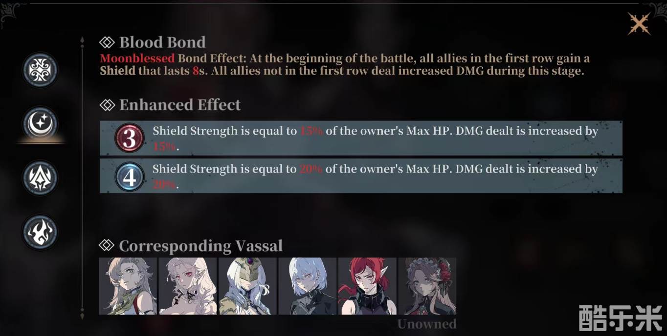 血脉关系:战斗开始时第一排所有角色获得1个持续8秒的护盾,所有不在第一排的角色本回合增强造成的伤害。