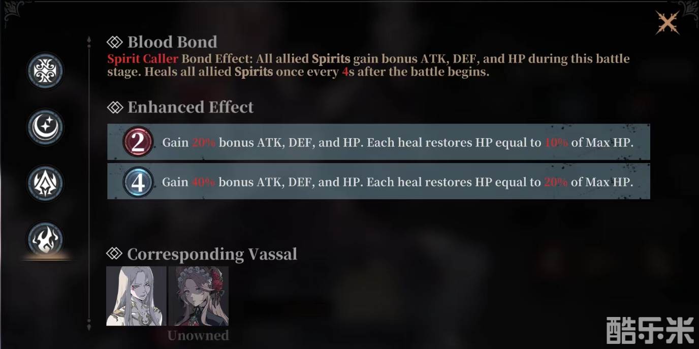 血脉关系:所有同阵营角色本局战斗阶段获得额外攻击力,防御力和血量。战斗开始后每隔15秒治疗一次所有角色。