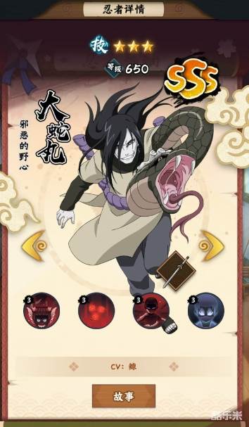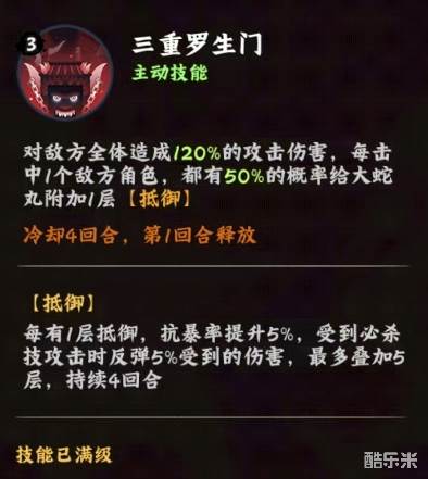 大蛇丸身为木叶三忍之一,他凭借着对禁术、通灵术以及蛇系忍术的精湛掌控,可以展现出多变的战斗风格,其主动技能三重罗生门效果是很不错的,当此技能发动时,将对敌方全体造成伤害,只要击中对面的目标他都有50%的概率为自己增添一层抵御效果,该技能冷却时间为4回合,并在战斗的第1回合便会果断释放,而抵御这一特殊状态更是妙不可言,每拥有一层抵御,在抗暴的效果上面就有5%的加成,如果对面是用的大招输出那么可以直接反弹5%回去,最多可叠加至5层,持续时长高达4回合,如此一来大蛇丸在面对敌人的猛烈攻势时,不仅自身防御能力得到增强,还能将部分伤害回馈给对手,打乱对方的战斗节奏。