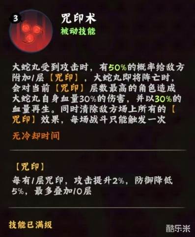 再看他的被动是在自身被对面攻击且受伤的时候,有50%的几率给敌方施加一层咒印,倘若大蛇丸生命垂危、即将阵亡之际,他会对当前咒印层数最高的角色发动致命一击,造成自身血量30%的伤害,同时自身以30%的血量重生,然后会将场上之前的咒印全部都取消,不过每场战斗仅能触发一次,此外咒印还具备增减益效果,每有一层咒印,攻击提升的同时防御层面就会下降,但是百分比提升会比防御上少,最多可叠加10层,这使得大蛇丸在战斗中既能通过咒印削弱敌人,又能在关键时刻实现逆袭。