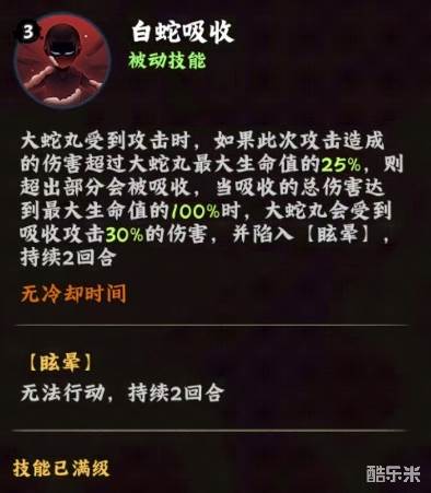 还有白蛇吸收这一被动技能也颇为亮眼,当大蛇丸承受的攻击伤害超过其最大生命值的25%时,超出部分将被他吸收,一旦吸收的总伤害累计达到百分百的生命数值,此时大蛇丸虽会受到吸收攻击30%的伤害并陷入眩晕状态,持续2回合无法行动,但他却能在此前凭借这一机制有效缓解自身的生存压力,在战斗中持久续航,所以玩一些后期阵容大蛇丸还是可以的。