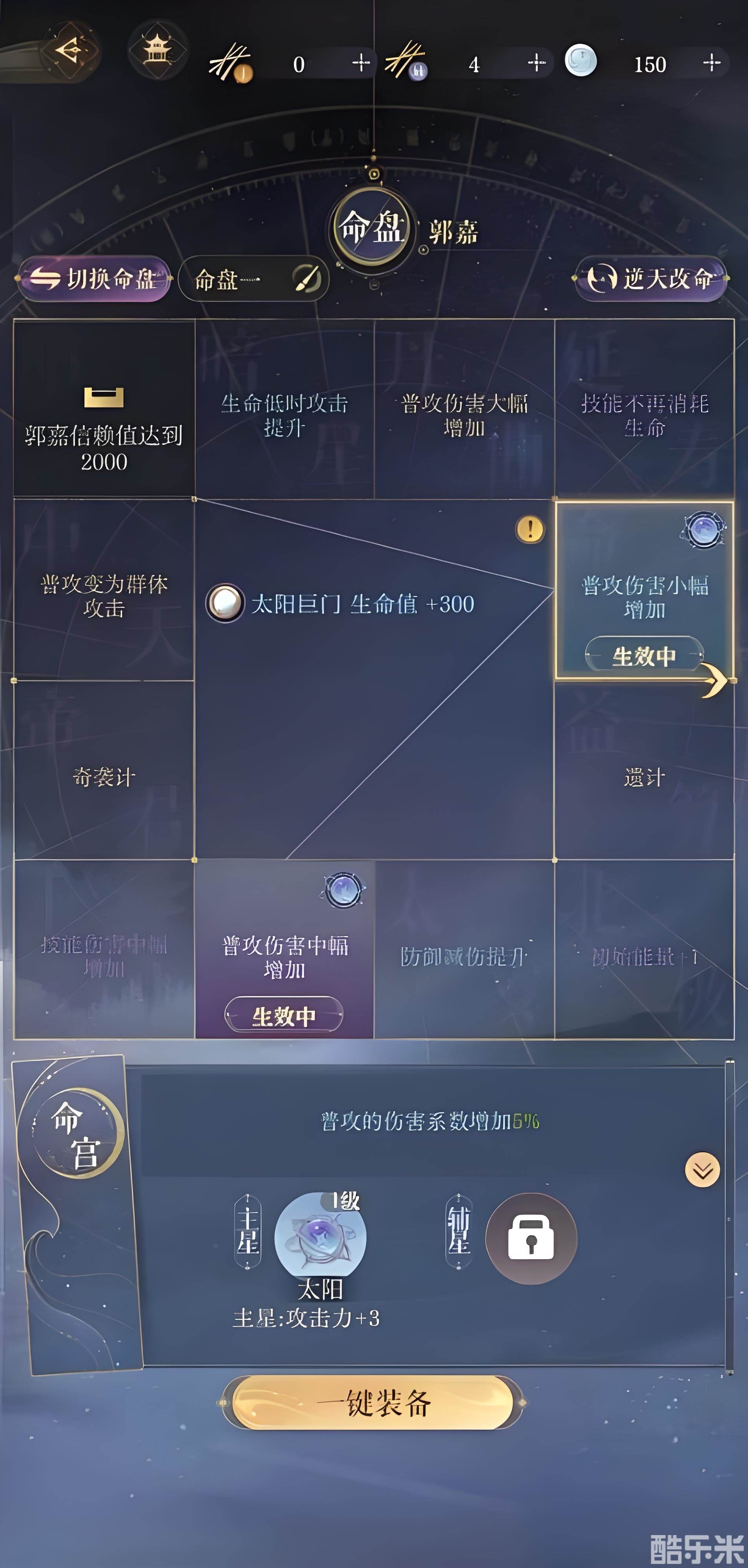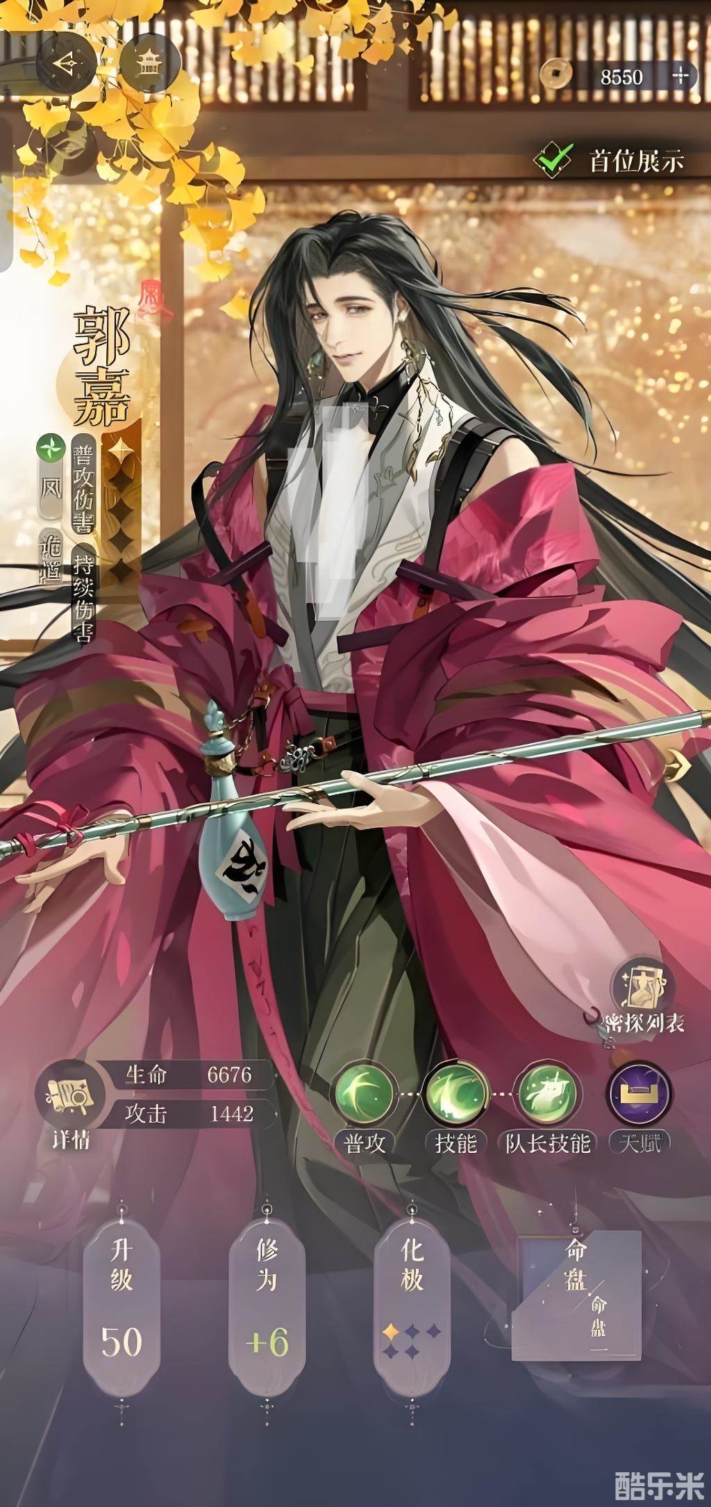 郭嘉前期技能厉害好上手,属性是风属性的诡道密探,他的群攻能力很强大。释放普攻可以解析队友普攻同时降低敌人普攻,免伤可叠加30层,但用技能打该敌人会清除。他的命盘中有一个奇袭计,队伍全体第一次放技能视为普攻,然后叠加普攻减伤,之后放一波技能带走敌人。还有可以普攻变群体的盘,以及死亡提升队友增伤,根据需求选择就好。