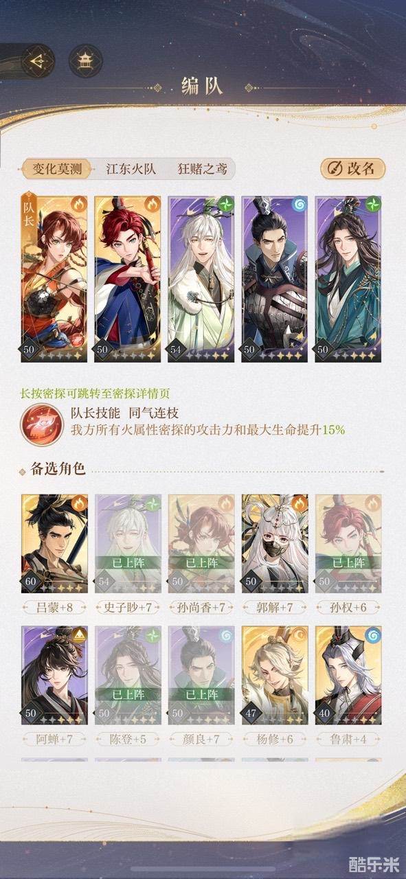 火队:郭解、孙权、孙尚香、吕蒙、陆逊。可以给全队火属性伤害升级。